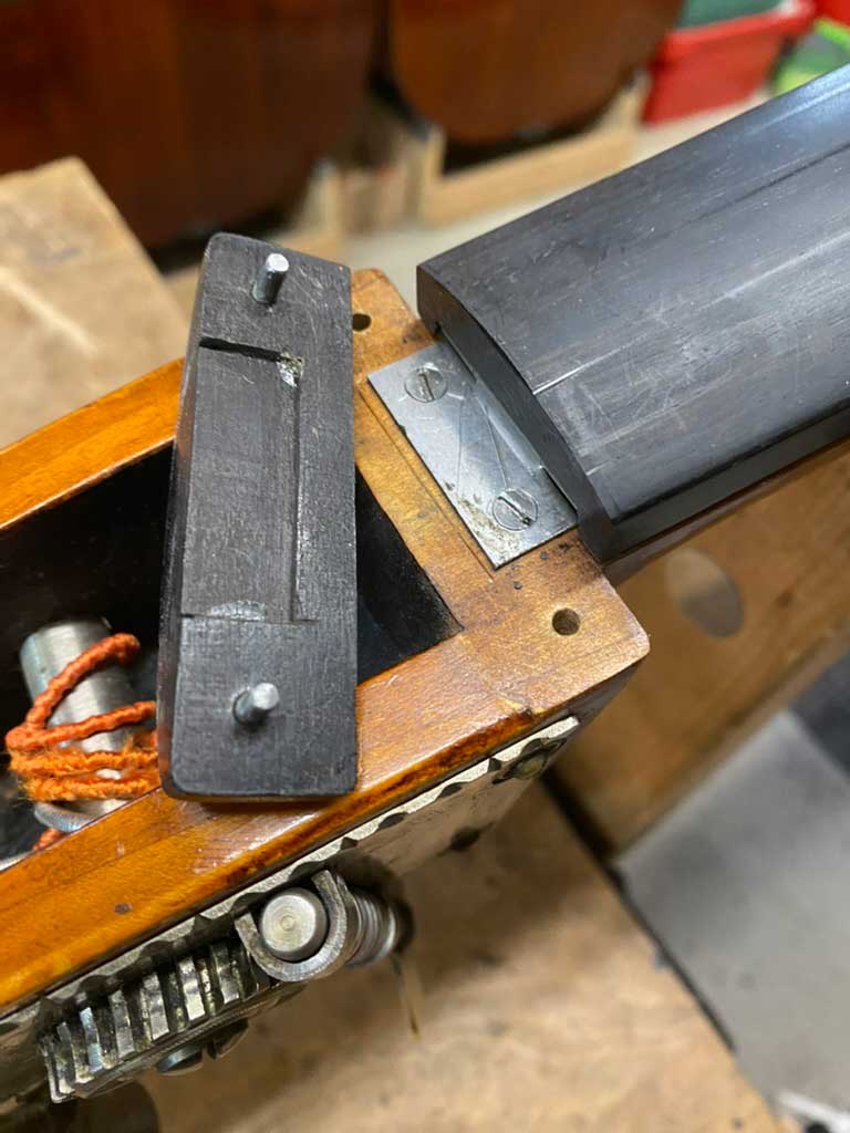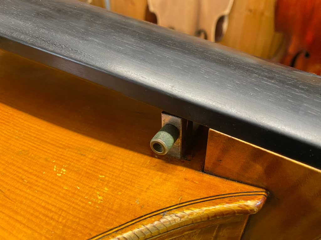 Ganz ohne Verstellmöglichkeiten ist der Bass aber jetzt dennoch nicht: der Steg bekam Franz Mosers Stegschrauben, und auch ein verstellbarerer Untersattel wurde montiert.