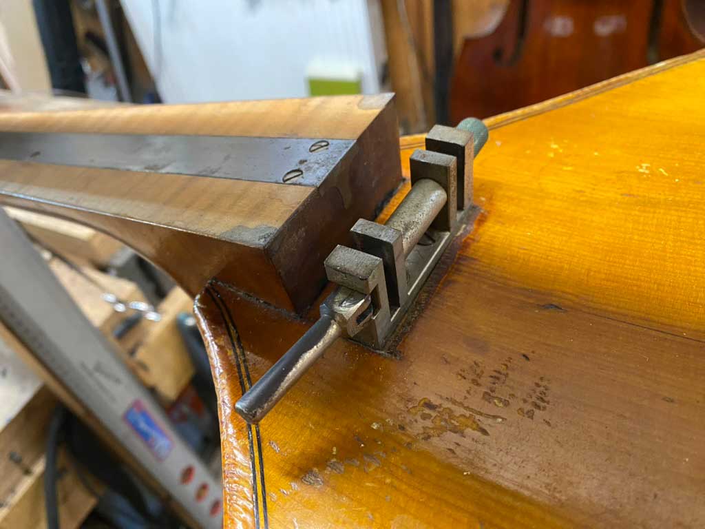 Ein Kunde brachte mir unlängst einen interessanten Bass, der vor einigen Jahrzehnten vom Vor-Vororbesitzer mit einem höhenverstellbaren Griffbrett (sic!) ausgestattet worden war. Das Griffbrett wurde dazu mit einem Scharnier unter dem Obersattel mit dem Hals verschraubt. Unter dem Griffbrett-Überstand war der Neigungsinkel des Griffbretts mit einem Kniehebelspanner verstellbar. Eine T-Schiene aus Edelstahl stabilisierte den Hals, der sich ohne das fest verleimte Griffbrett sonst sicherlich verzogen hätte. Heute würde man hier zu einer Carboneinlage greifen, aber das Material stand in den 1950ern noch nicht zur Verfügung.