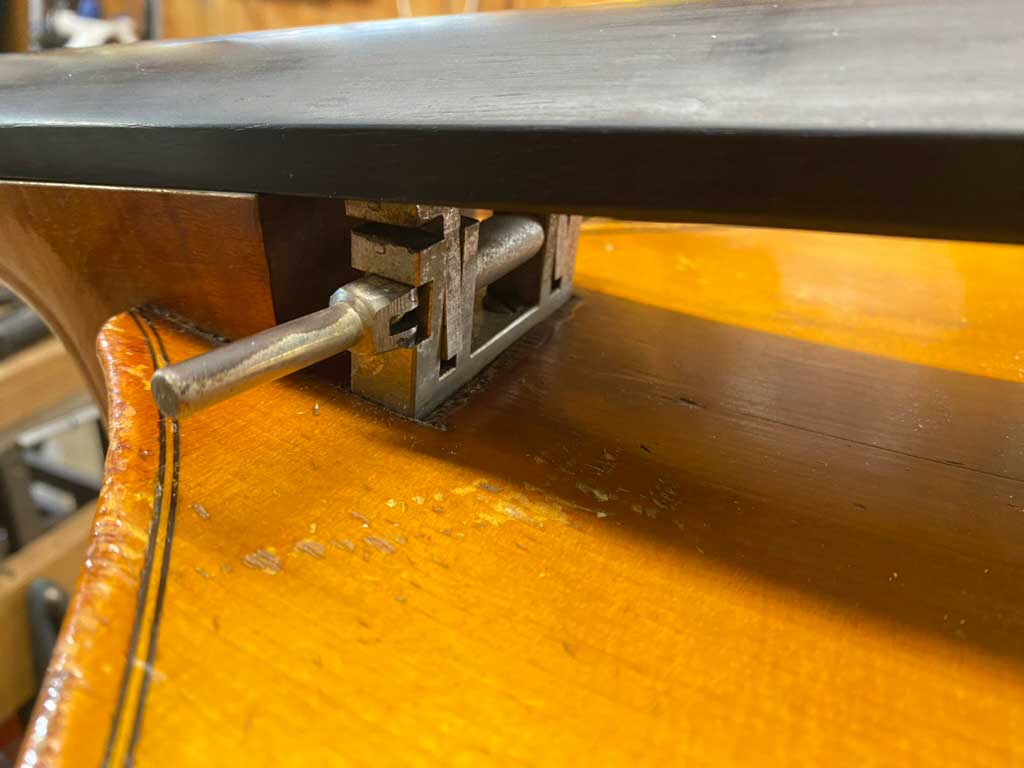 Ein Kunde brachte mir unlängst einen interessanten Bass, der vor einigen Jahrzehnten vom Vor-Vororbesitzer mit einem höhenverstellbaren Griffbrett (sic!) ausgestattet worden war. Das Griffbrett wurde dazu mit einem Scharnier unter dem Obersattel mit dem Hals verschraubt. Unter dem Griffbrett-Überstand war der Neigungsinkel des Griffbretts mit einem Kniehebelspanner verstellbar. Eine T-Schiene aus Edelstahl stabilisierte den Hals, der sich ohne das fest verleimte Griffbrett sonst sicherlich verzogen hätte. Heute würde man hier zu einer Carboneinlage greifen, aber das Material stand in den 1950ern noch nicht zur Verfügung.